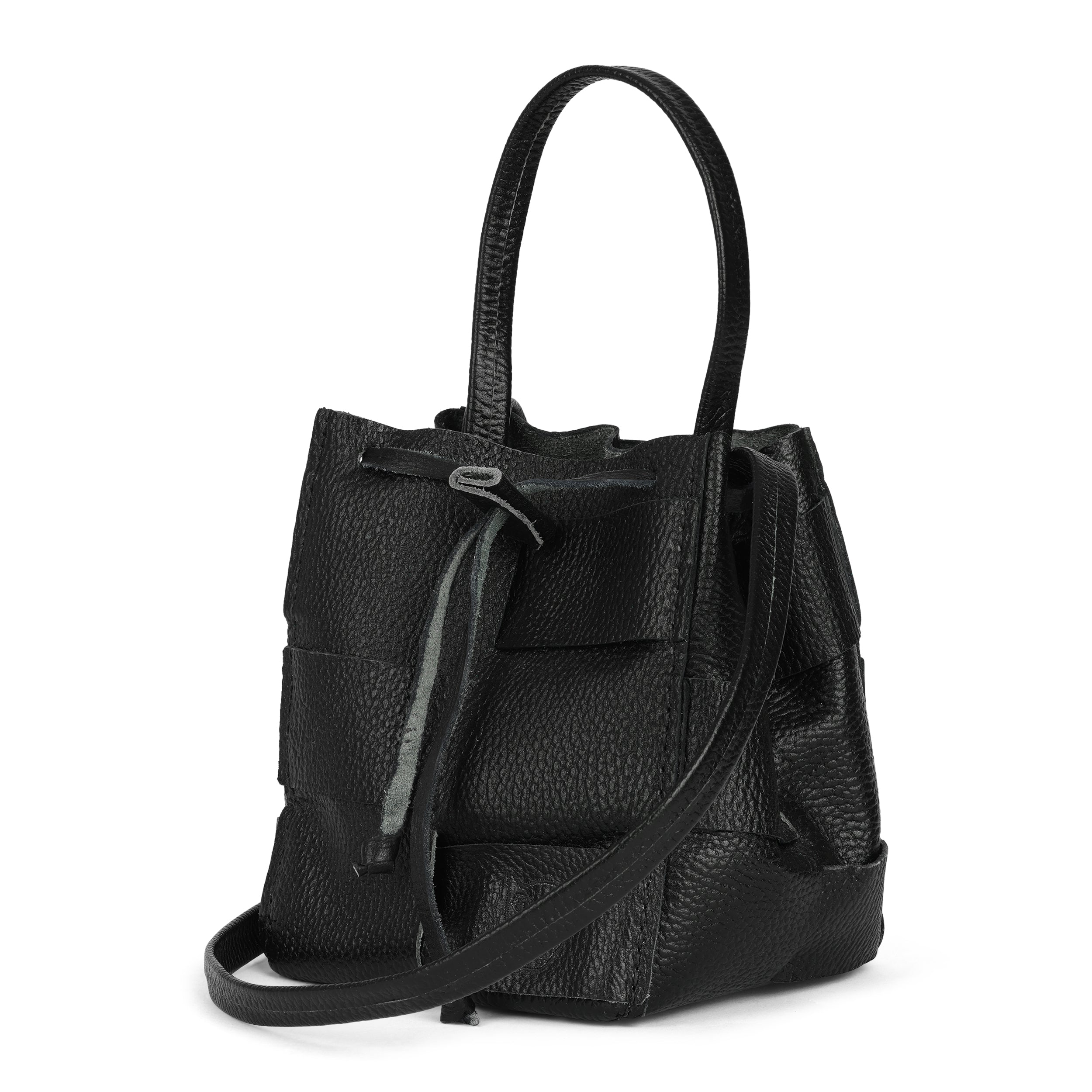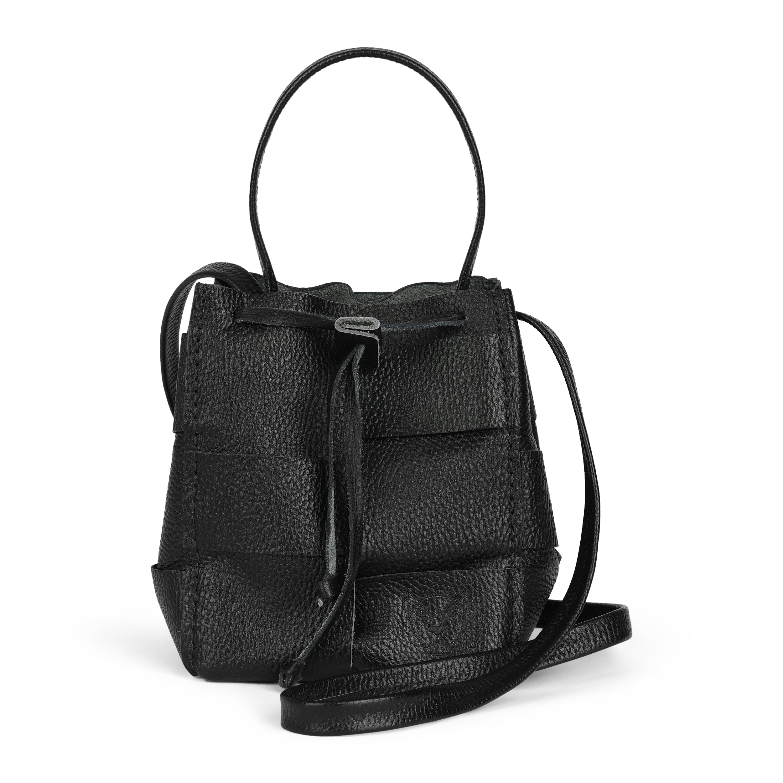 Crossbody bucket bag, hand woven with soft pebbled leather. Hand woven with drawstring closure. Part of our 'Deconstructed Line', this piece has no hardware, highlighting the value of it's handmade, environmentally mindful nature.
