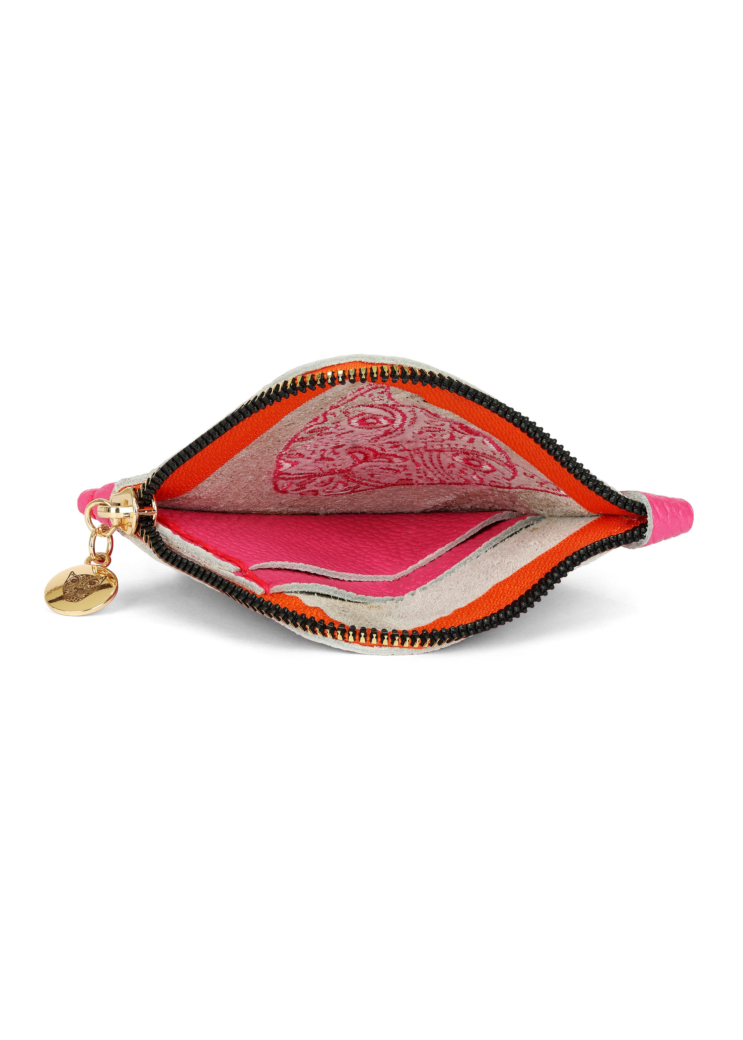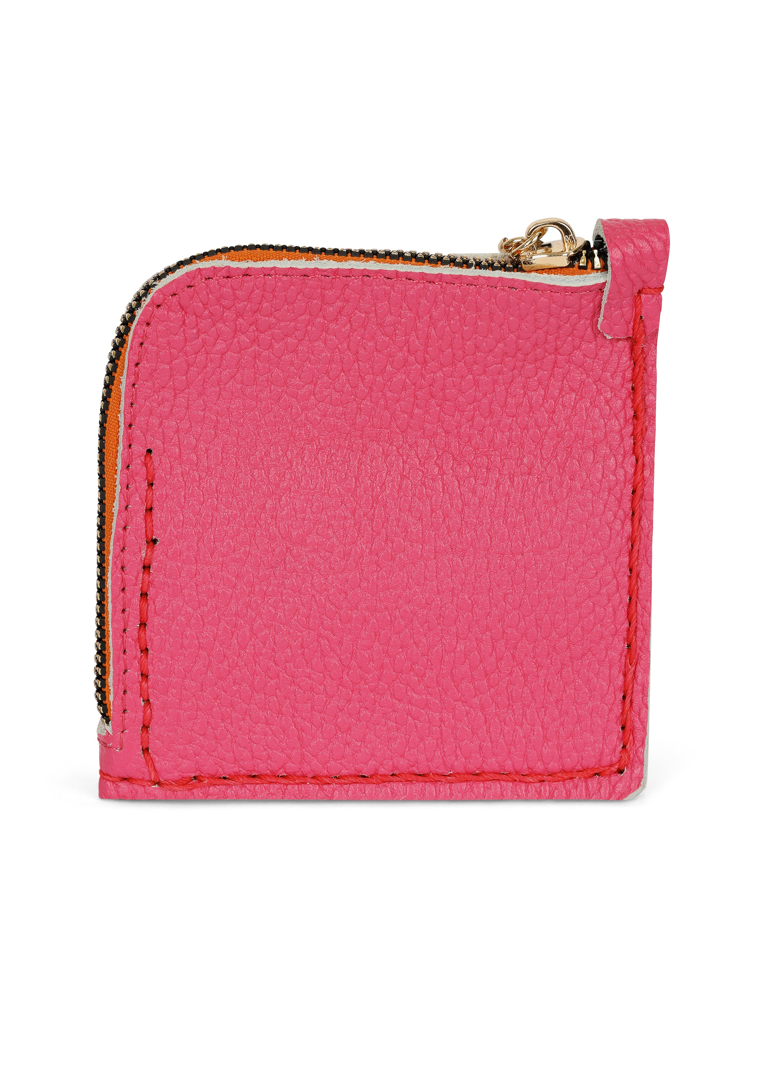 Slip this compact, zip-around wallet into any bag or back pocket. With vibrant contrast colored embroidery and zipper, this bold leather piece has two interior card slots and all the space you need for cards and cash.