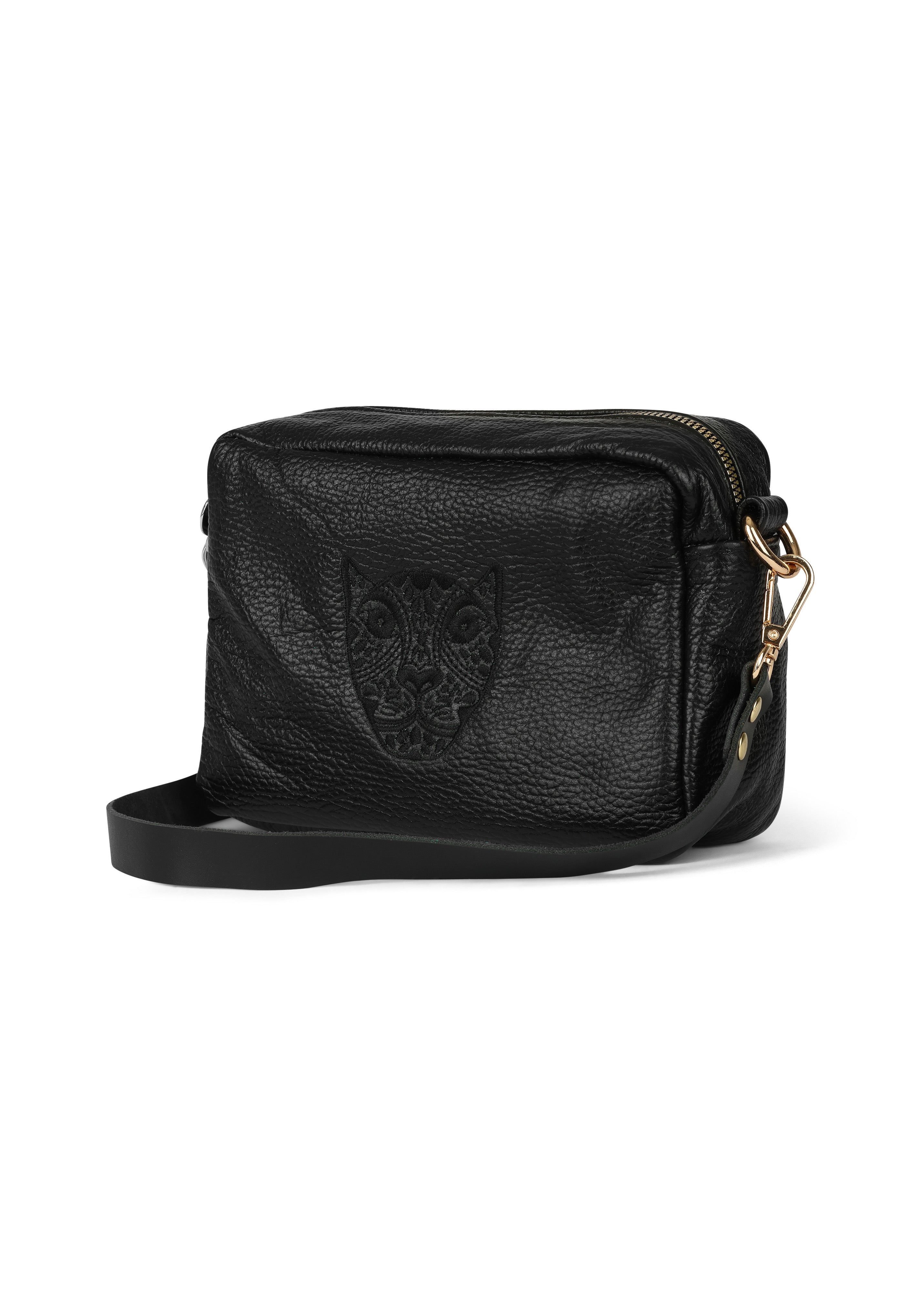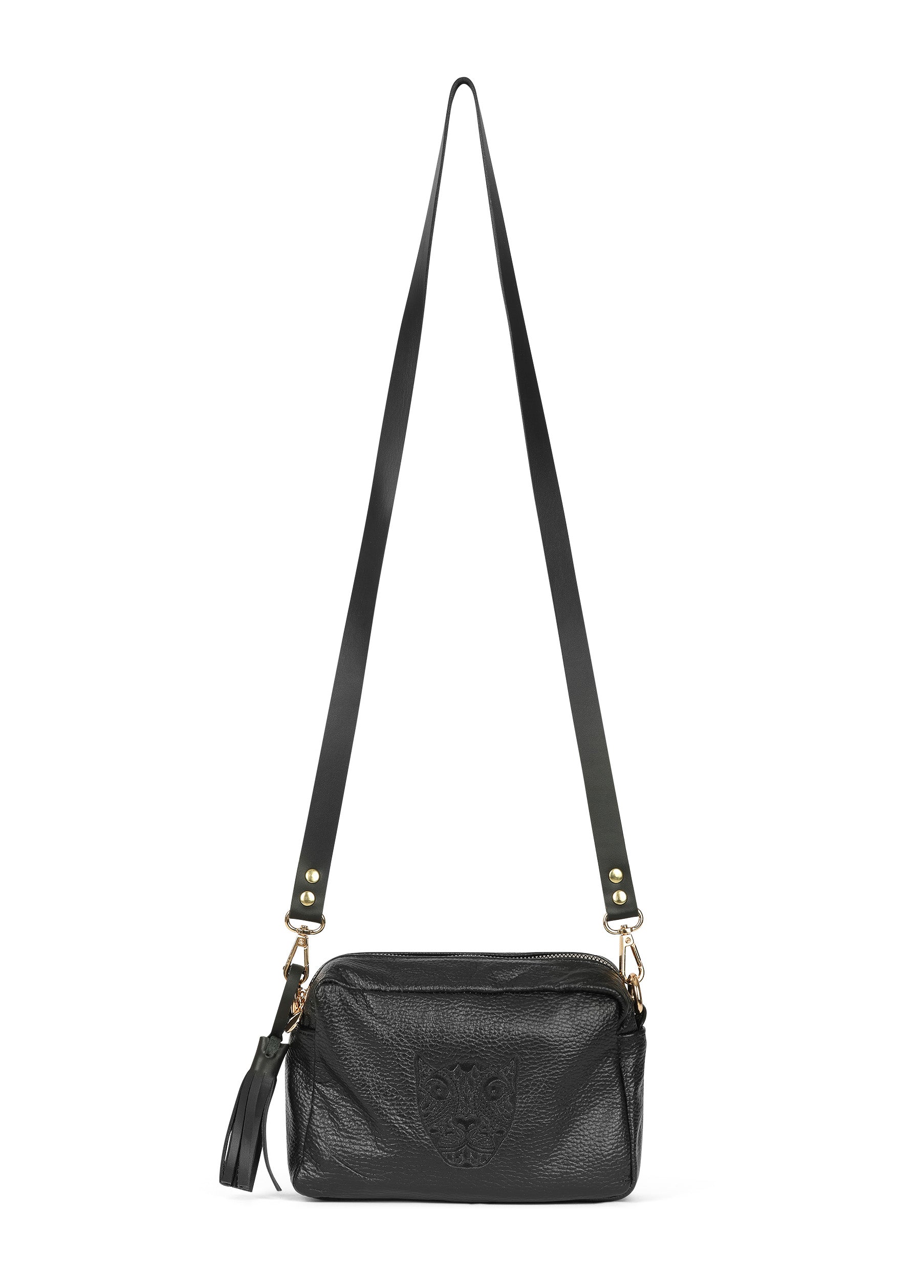 The Lucia with embroidered Jaguar is our structured rectangular mini crossbody, the ideal everyday, hands free bag in a soft pebbled leather hand made by artisan partners in Mexico, with gold colored hardware and a 7 inch handmade leather removable tassel.