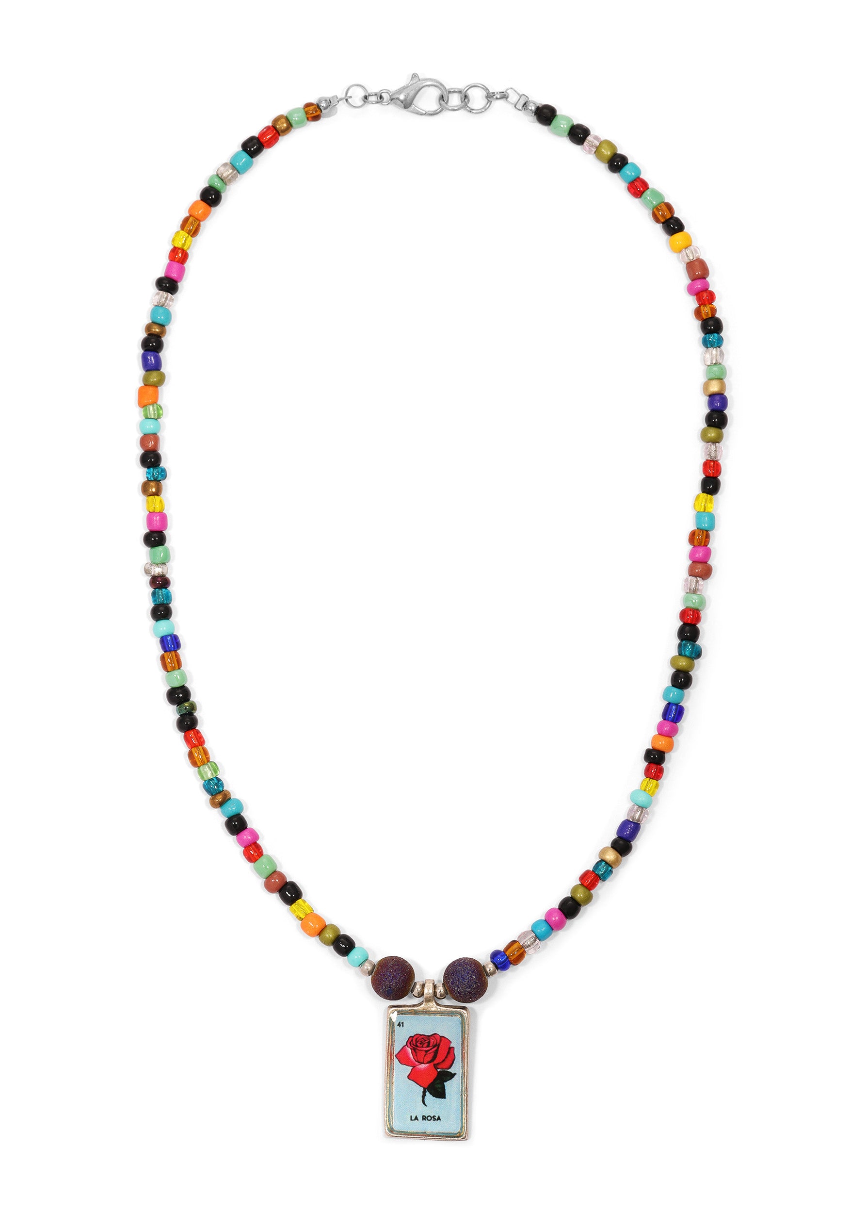 Blue colored rainbow glass beaded necklace with 'La Palma' Loteria pendant.
