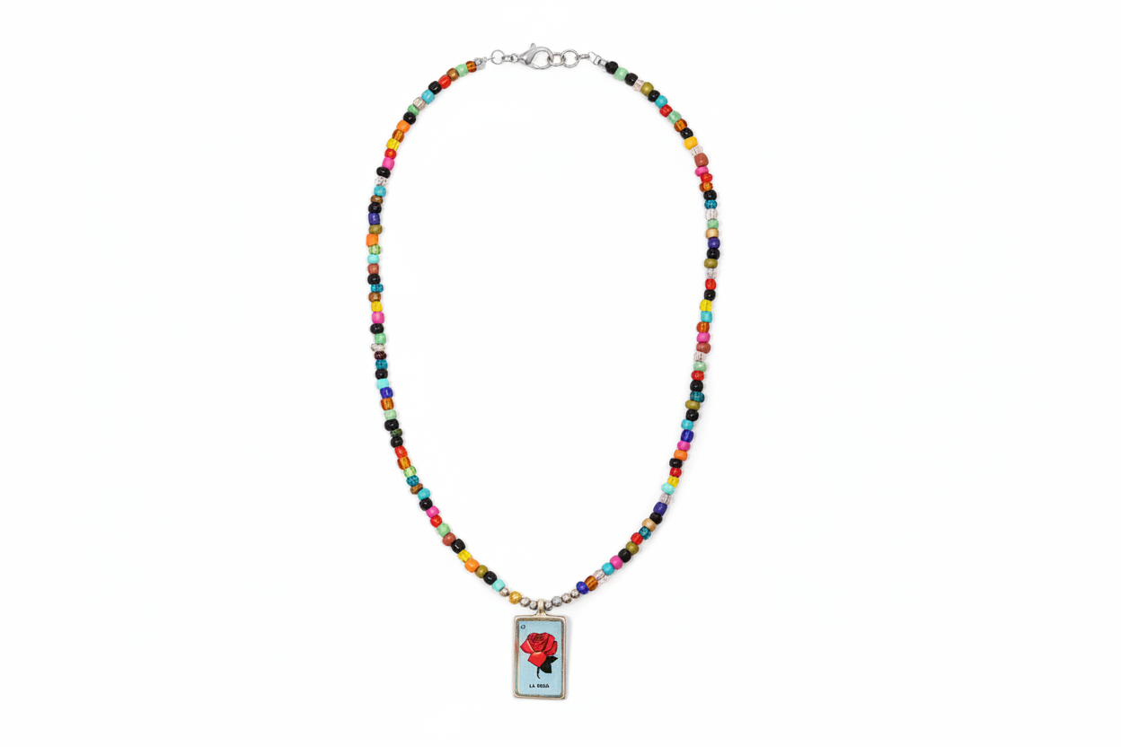 Multi-colored rainbow glass beaded necklace with 'La Rosa' Loteria pendant.
